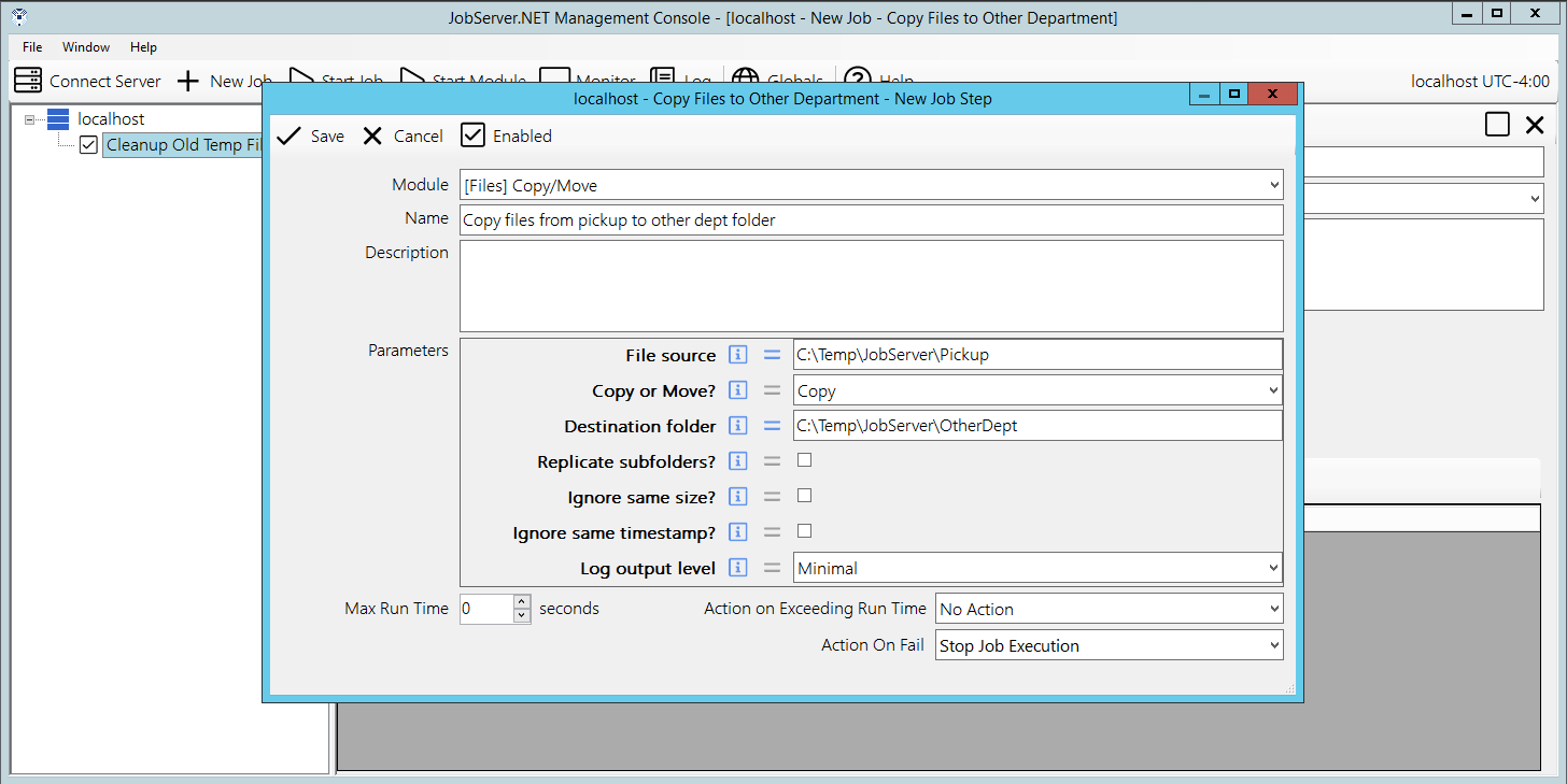 Next create a step for this job by clicking the New Step button. In the Module field, select the [Files] Copy Move module. In the Name field, change the text to “Copy files from pickup to other dept”. Then in the parameters, we want to specify the File source as the example folder “C:\Temp\JobServer\Pickup”. Then select the Copy option for the Copy or Move parameter. And finally, you want to specify the Destination folder as “C:\Temp\JobServer\OtherDept” before you click the Save button to complete the settings for this step.