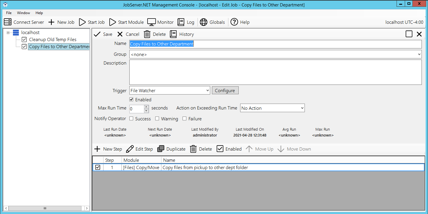 And finally, click the Save button on the job definition to create the new job. Once you do this, the job is now active and any files you place into the Pickup folder you created, will be immediately be copied to the OtherDept folder. This functionality works with files on local storage, or on network paths. The only requirement is that the JobServer.NET service must have permissions to the filesystem the files and folders are stored on.