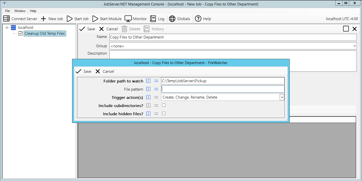 To start with creating an example FileWatcher, create a new job definition by right clicking your server and selecting New Job. When the new job form appears, change the Name to “Copy Files to Other Department”. Then go to the Trigger field and select FileWatcher. When the parameters dialog for FileWatcher appears, go to the Folder path to watch setting and add the value “C:\Temp\JobServer\Pickup”. Then in the Trigger actions field, select the All option. You can now click the Save button to finish creating the trigger.