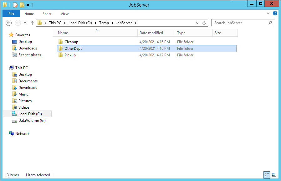 Since the following topics in this section will walk you through creating some example jobs, you will want to prepare for this by creating or picking an appropriate test folder location. Most Windows machines may have a temporary folder as C:\Temp. This should be fine for most people, but you can certainly pick any location that is more suitable. Just substitute your desired path for C:\Temp in the examples below. To start with, create a JobServer folder in C:\Temp, and then underneath the JobServer folder, create the following subfolders: Cleanup, OtherDept, and Pickup. You should wind up having the following folders: