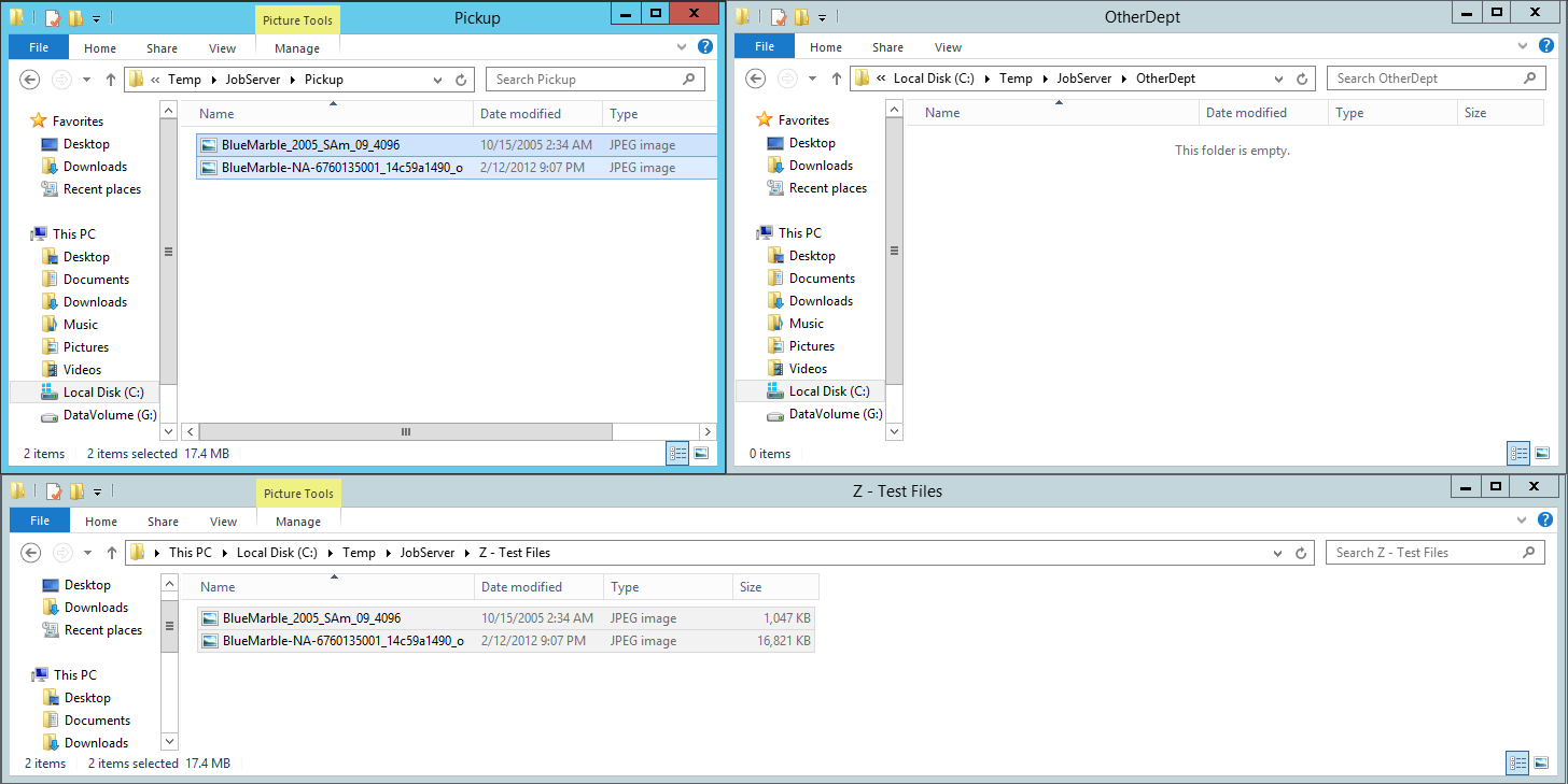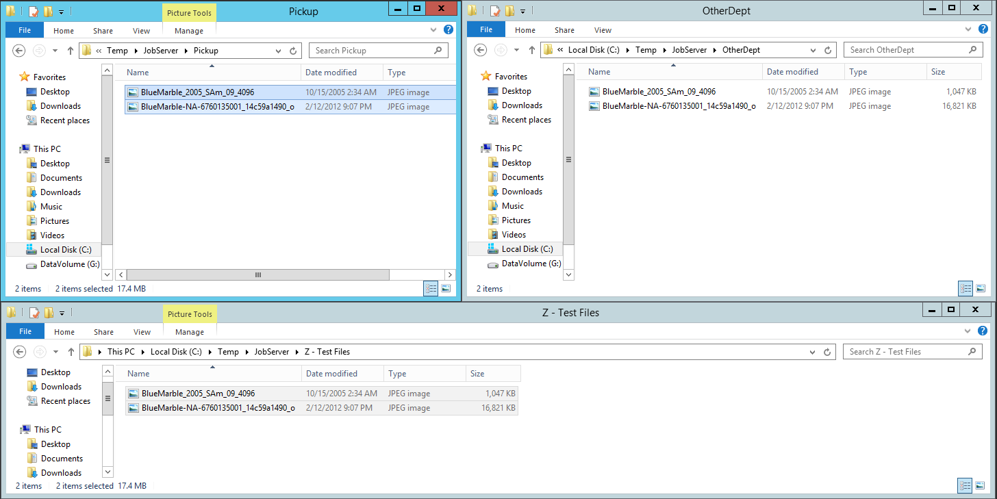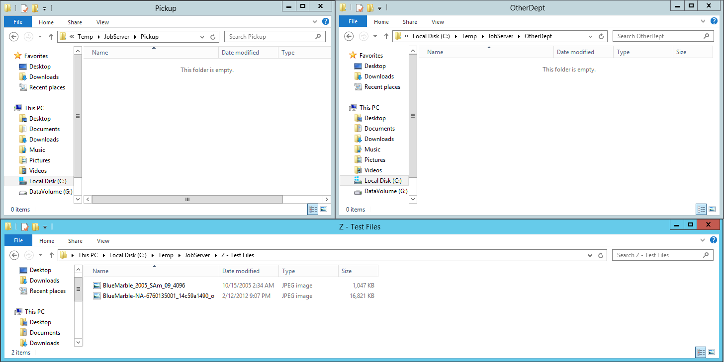 Now with the job defined and enabled, you can test out this event based job definition by putting some files into the folder it is watching, the source folder or Pickup folder as we have named it in the example steps above. Then we watch as the job gets triggered and executes by copying the files we send it to the configured target folder, named OtherDept in the example steps above. This will happen pretty fast, so you will have to pay close attention to see it happen. To try it, we arranged a few file explorer windows to make it easy to view all of them at once. The one on the bottom contains a few example files we are going to drag into the Pickup folder.