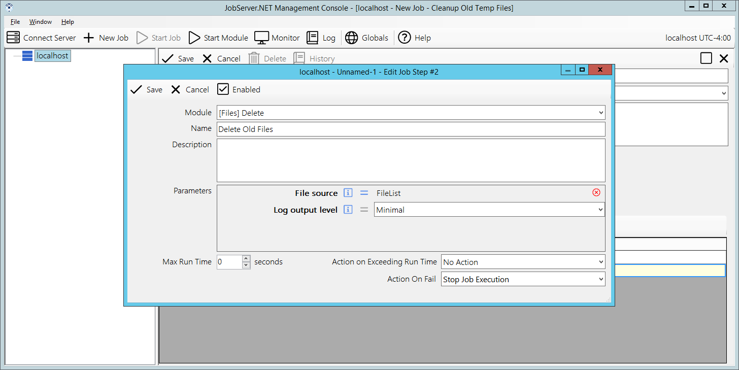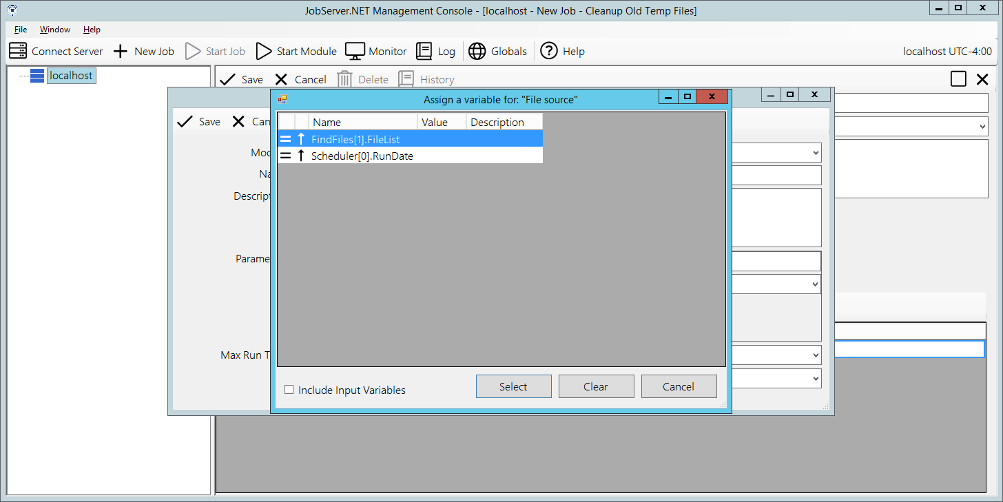 We now have a job definition with a single step defined which retrieves a list of files. Next we want to do something with that list of files. We do this by adding another step after the first one by again clicking the New Step button. This time when we get the new job step dialog, we want to select the [Files] Delete module. Update the Name field by entering “Delete Old Files” into it. The File source parameter listed here just needs to be connected to the list of files that the previous step has found for us. To do that, select the Assign button on the line for the File source parameter. This is the button that looks like an equal sign. Once you do that, you will see the assignment dialog with a list of all the possible variable and parameter options. You want to locate the one from the FindFiles module in Step 1 with the output parameter of FileList. The FileList parameter name is used by [Files] Find and some other modules to output a list of files that the module has worked on or found in this example.
