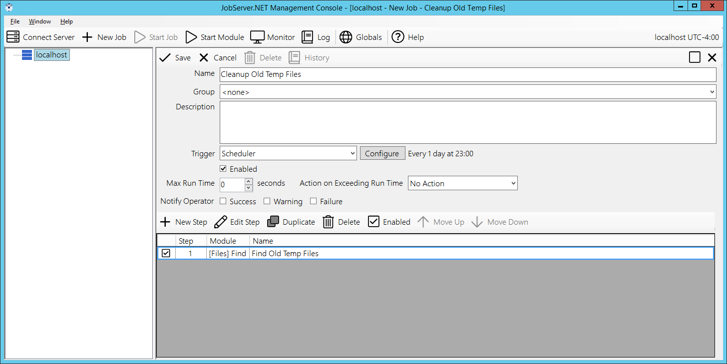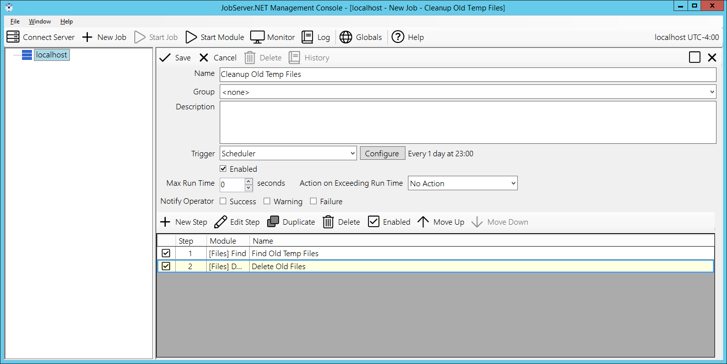 Once you click the Save button as the top of the job definition, you will see the job is added to the navigation panel under the server and the job is now active. It will clean up any of the older files it finds in the folder you specified at its scheduled time every day.