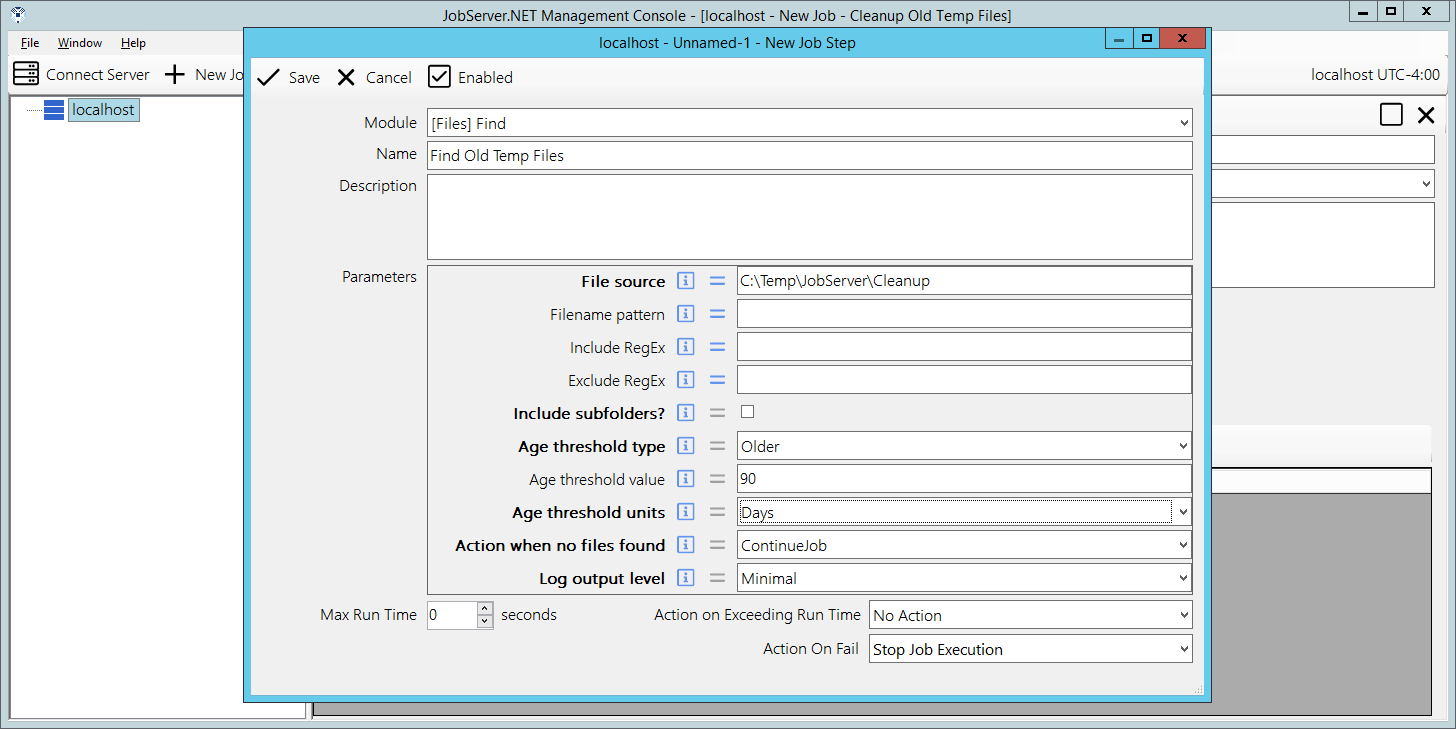 When that has been selected, you should now see the Files Find module has loaded and is now showing all the configuration parameters available. Before we just to that, update the Name field by entering “Find Old Temp Files” into it. Then locate the first parameter called File Source and add a path to a folder on your JobServer.NET machine that contains some old files you no longer want to keep around. For testing, we will use one of the test folders we created above. So, for this example we are putting the folder path of “C:\Temp\JobServer\Cleanup” into the File source parameter. Next, we change the Age threshold type parameter to a value of Older. Then we set Age threshold value to 90. And finally set Age threshold units to Days.