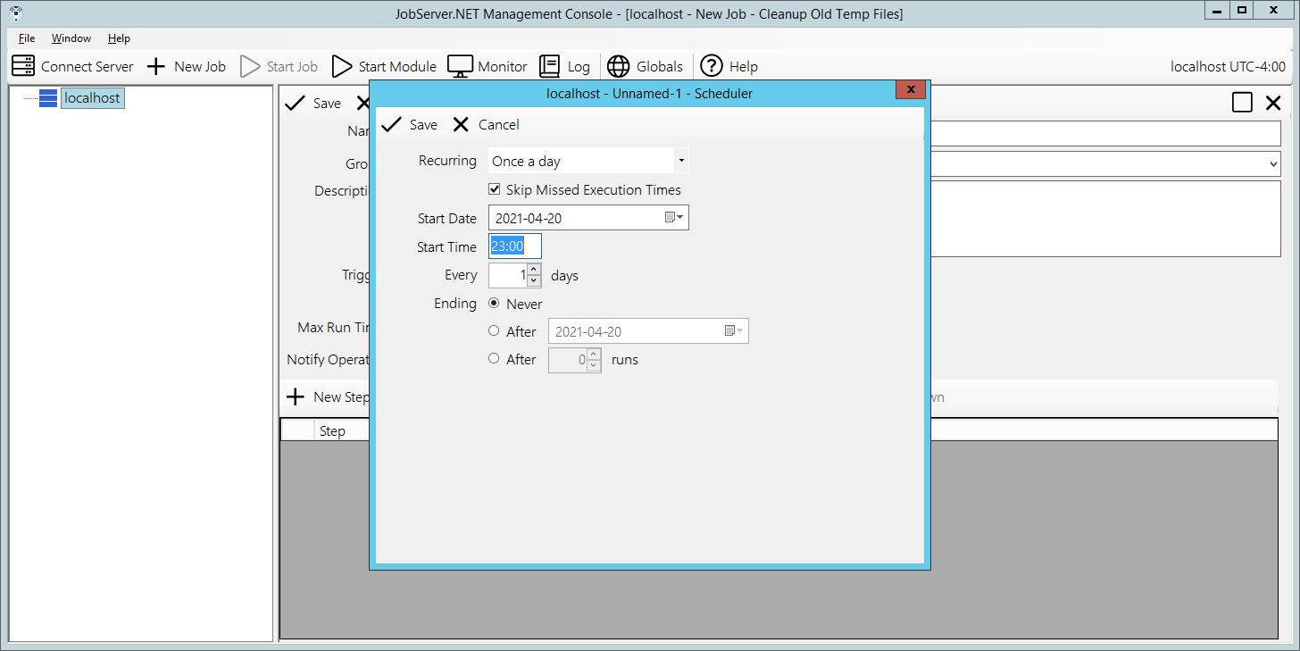 Once you do, you will see a new dialog open with the options for the scheduler trigger. The first step of course is the only visible option so far, picking a Recurring option. Start off by picking the Once a day option, as the other options are covered in more detail later. The Start Date will default to the current date, so we just want to pick a time of day you want to cleanup some old files. Since JobServer.NET displays times in 24-hour format, pick a time suitable for you. We might recommend entering 23:00 so this job will run an hour before midnight each day. Click the Save button when you are ready.