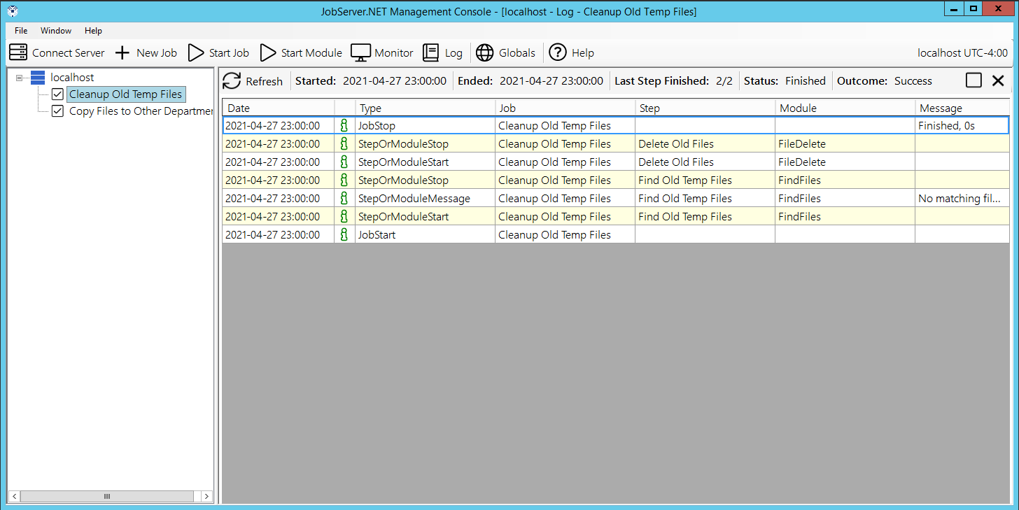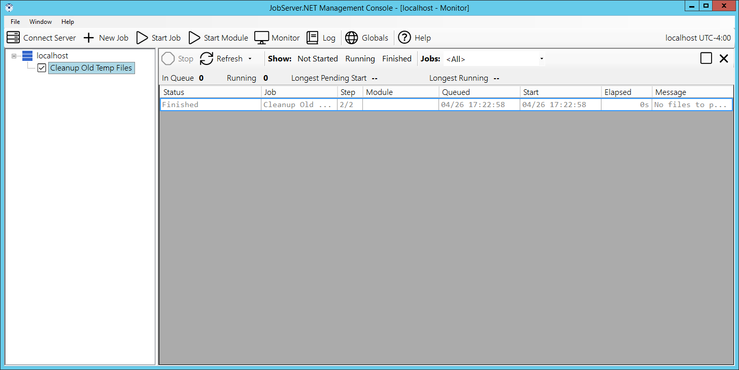 After the job has finished running you will see it continues to display in the monitor for a few minutes afterwards. This is so you have a chance to view the very recently completed jobs in the monitor. Now review the files in your folder and you should be able to confirm that any files you placed there over the specified age have been successfully deleted.