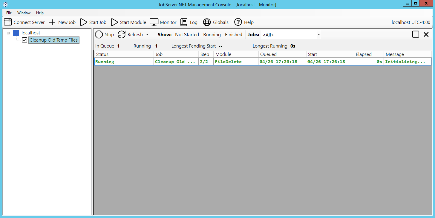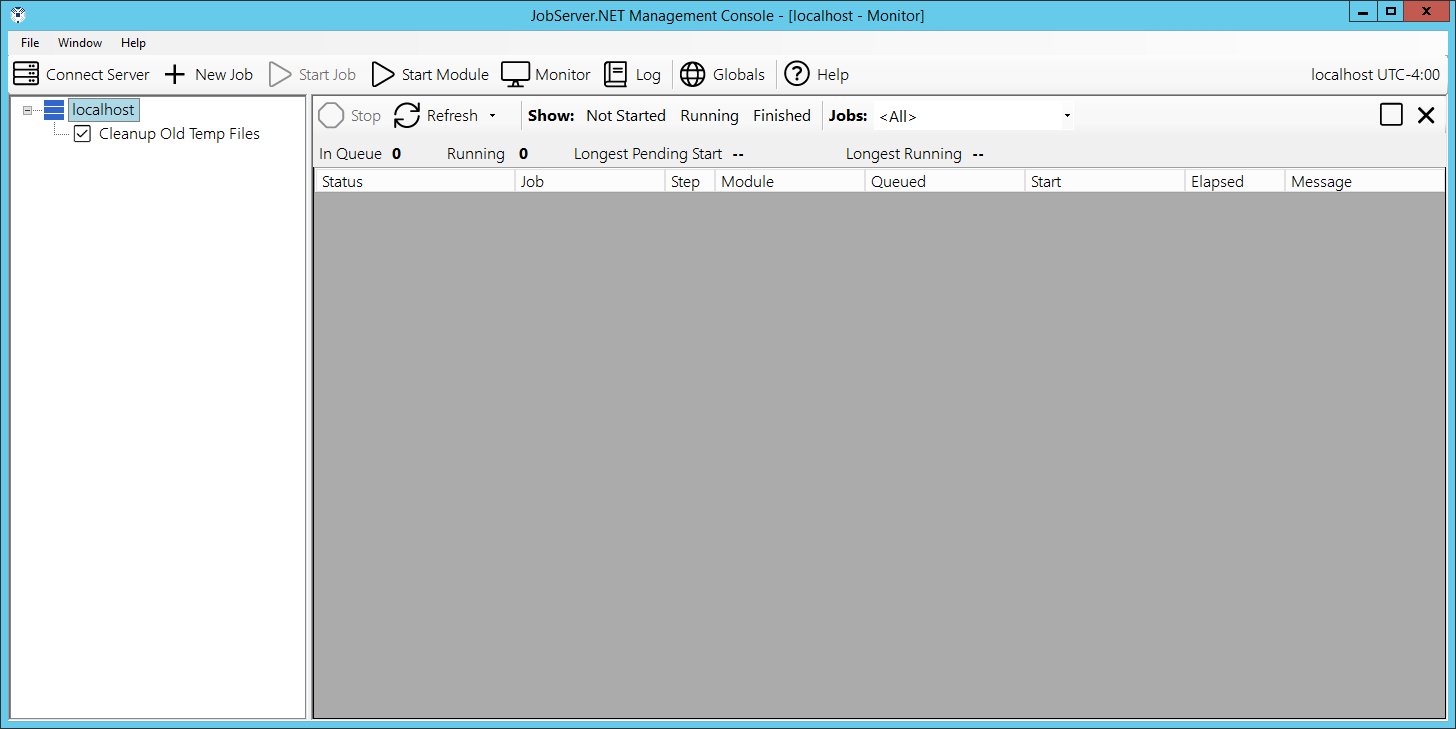 You now have your first job ready to run. To try it out be sure to add some files to the folder you specified when you created job step 1 in the above exercise. Make sure some are files older than your age setting (older than 90 days if you followed the example exactly). And be sure to include files that are newer. But once you have done that, you do not want to wait until late at night to see what happens when the job is executed. We will see how you do that in just a moment. First, you want to locate the Monitor button on the toolbar of the Manager application and click it. This opens the monitor which shows you what jobs are queued and executing on JobServer.NET right now.