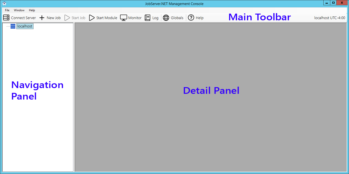 Once you are logged into the manager application, you can see that there are three main elements to the application’s layout. Below the menu bar on the manager window is the main toolbar. Most of the buttons on the main toolbar are not enabled and cannot be used until you have taken some other steps which we will get to shortly. The two buttons that are always enabled are the Connect Server button, which we will be addressing in one of the next sections. And there is the Help button which will open your default browser to the main help page for JobServer.NET.