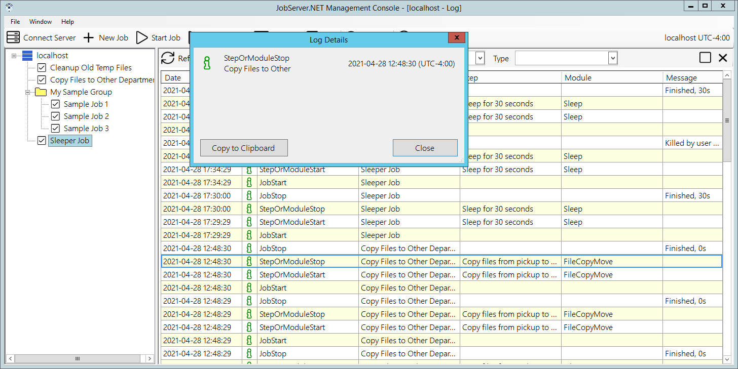 To delve into even more precise data, you can see the full log detail by double-clicking on any one of the run entries in the history grid. That will bring up the full log detail for just this individual run of the job. In the log detail, you will see step by step entries of what happened during the job process from start to finish. Double-clicking on any of the individual log entries will show the log detail record which for any entries that might contain a much lengthier message or set of messages than can be displayed in the grid, will get shown in a full view. It also provides you with a method to copy the log entry information to the clipboard if needed.