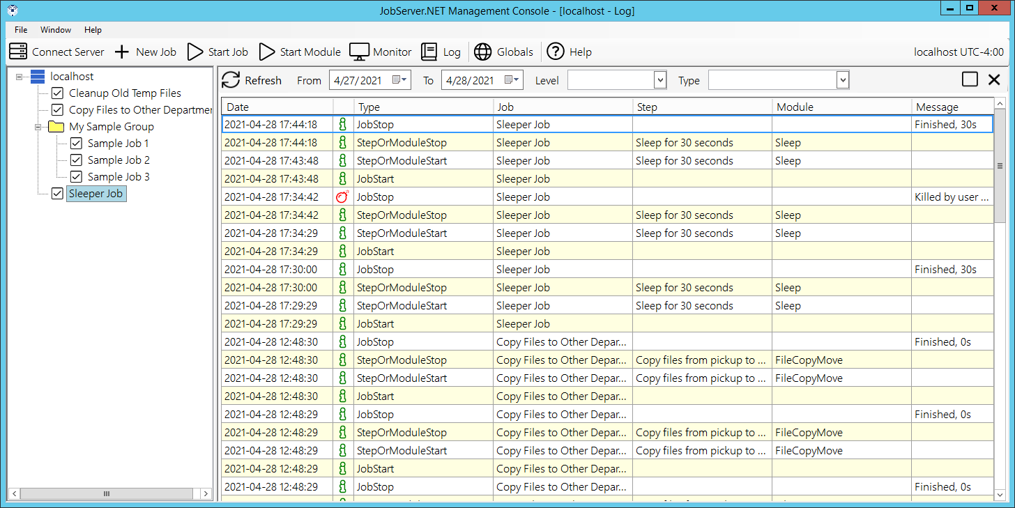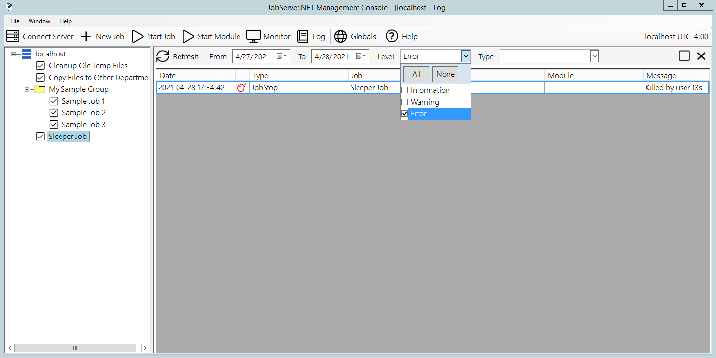 This may be the most useful way to look at specific activity that occurred during a known run of a job definition. However, you also can view and search the entire raw log for the entire JobServer. To open the whole server log, just click on the Log button that is found on the main toolbar. This opens the whole log viewer which you can scroll through or use the assorted options to filter out entries to locate specific events that might be occurring across multiple jobs. An example of one thing you might use this for is to click on the dropdown for the Level filter at the top of the log window and select (check) the Error option. Once you do that, you should see a list of all log entries for all runs of every job on the server that might have recorded an error event. By reviewing each one, you can assess if the recorded errors might be due to normal environmental issues that might happen, or if there is some intervention needed to correct an issue somewhere.