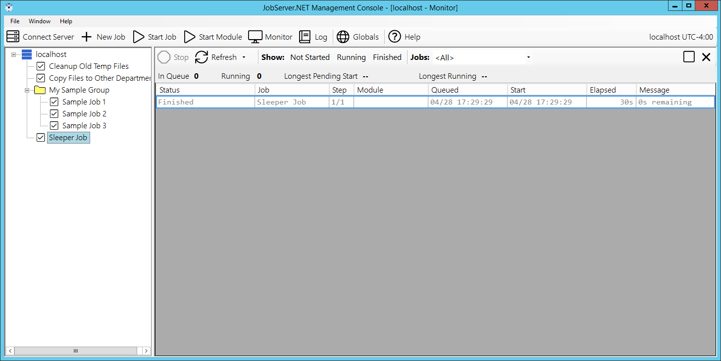 If by this time the example sleeper job is still running, allow it to finish and you will notice how when the job completes, the status changes to Finished and the job is still temporarily displayed in the monitor. This should allow you to continue viewing the status of recently completed jobs in the case where your job server may have many small jobs starting and completing rapidly. After about ten minutes, the finished jobs should automatically drop off the view from the monitor.