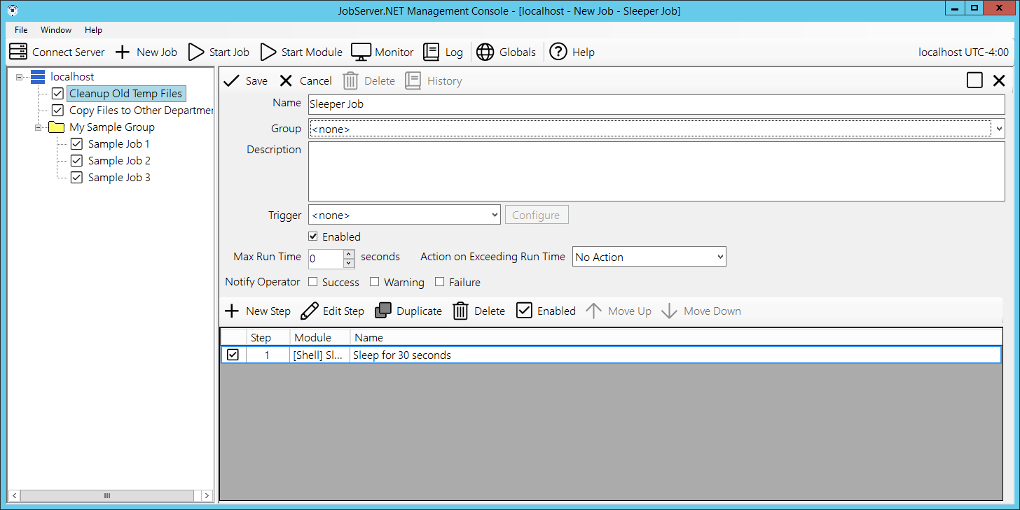 Click on the New Job button on the main toolbar and give the new job the name “Sleeper Job”. Jump down to the steps grid and click the New Step button just above the grid. First select the [Shell] Sleep module, then update the name to “Sleep for 30 seconds”, and finally in the parameters list, the Sleep Seconds parameter should be set to a value of 30. When ready, click Save to complete this step returning to the job definition. You may have noticed we did not create a trigger this time and it is set on None. This is fine as we do not want this job to run automatically. We are only ever going to run this job definition manually. Finish this job definition by clicking the Save button and you should be back to the monitor in the manager application.