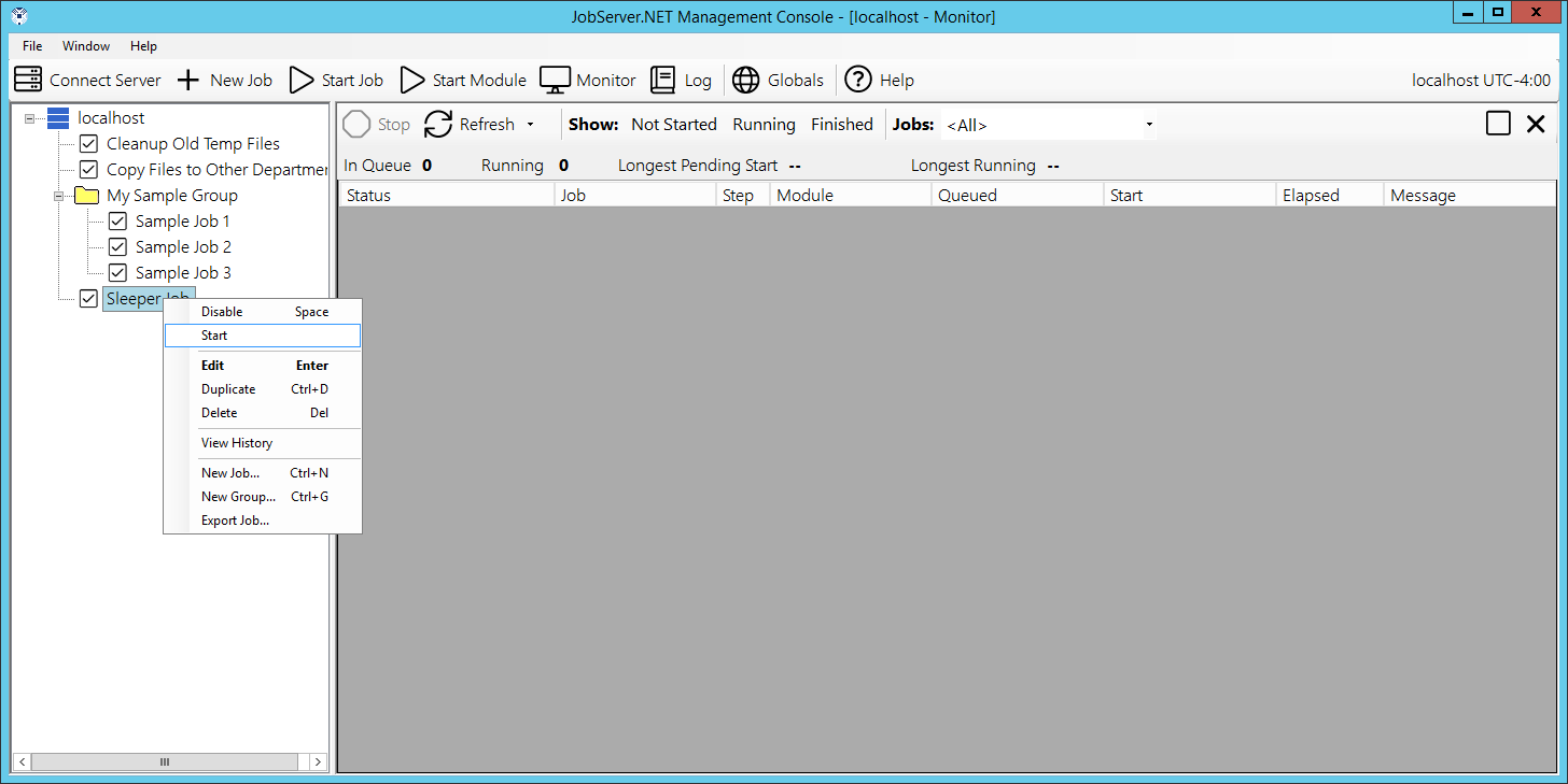 With the monitor window still open, find the “Sleeper Job” you just created in the navigation panel and right click on it to get the pop-up context menu. Select the Start option on the menu and you should see the job appear in the Running status in the monitor window.