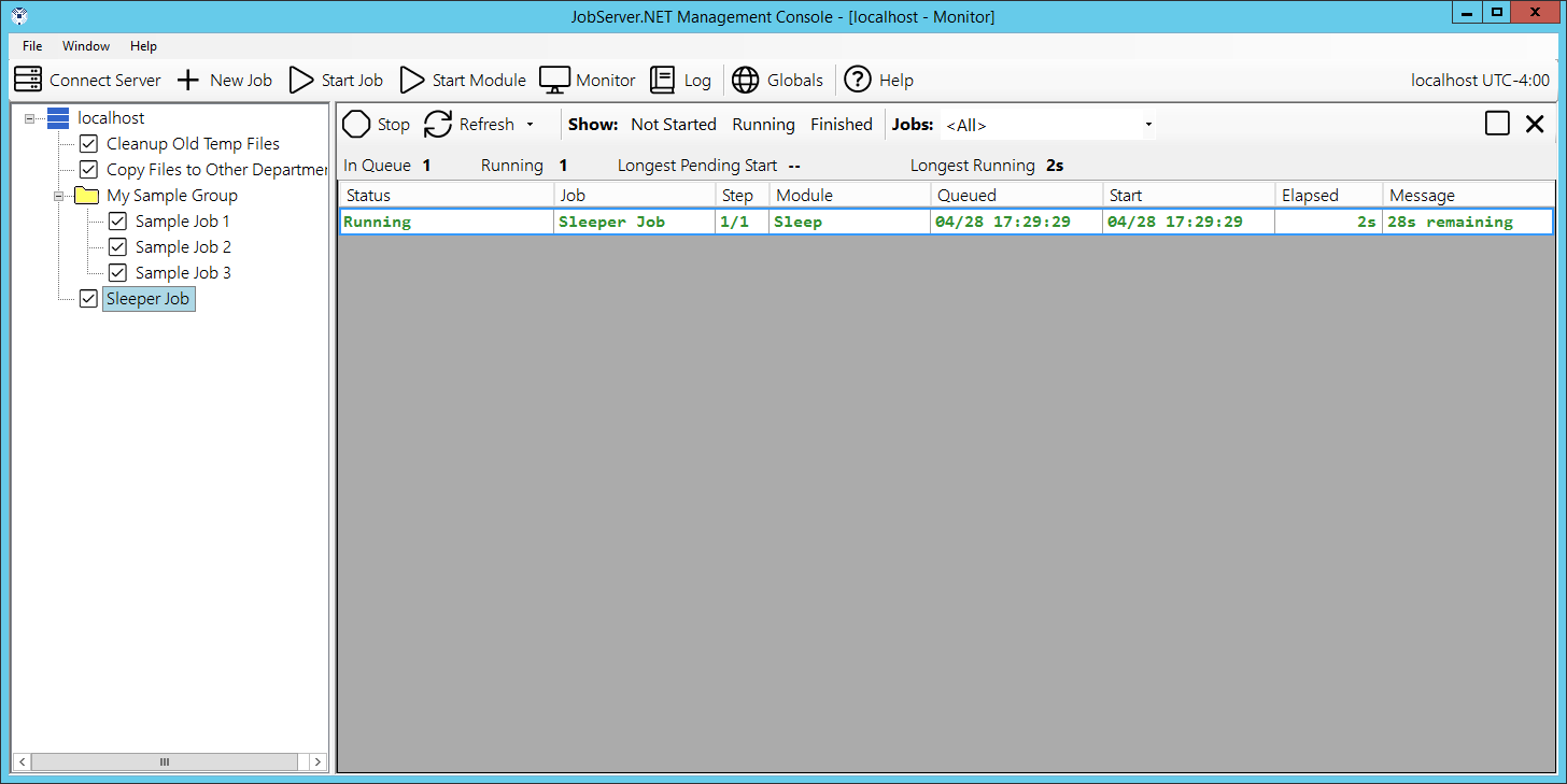 Note while this job is running that the other fields in the monitor grid show the steps and progress of the job. If the job is progressing through multiple steps, you will be able to see which step the job is currently working on. Since this is a simple one step job, we will focus on the Message column. You should notice that the message column is giving us real-time feedback on what is happening within the specific step, or module, that is currently executing. Modules generally are built to try to provide useful feedback on long running processes via this status message, but this can vary for distinct types of modules. With the sleep module we use in the example in this section, you can see it counting down the time remaining.